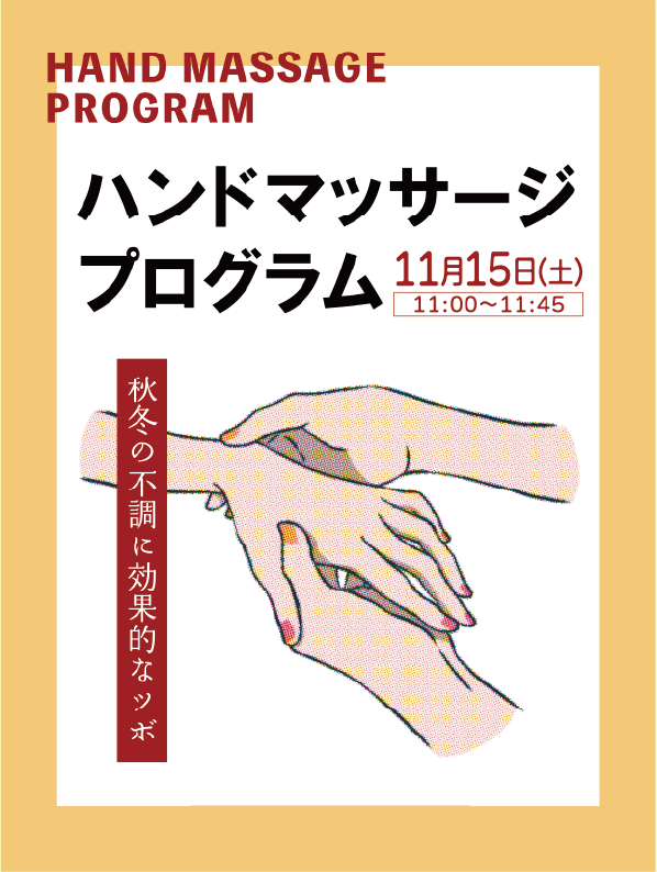 11/15(土)ハンドマッサージプログラム 「秋冬の不調に効果的なツボ」を開催します! 2025年11月7日 最終更新日時 : 2025年11月7日 led_staff_wp 11/15(土)ハンドマッサージプログラム 「秋冬の不調に効果的なツボ」を開催します!☃️ 季節の変わり目に感じる、なんとなくの不調。そんな時こそ、「ツボ押しケア」で優しく身体を整えてみませんか? 当日は、セルフケアに使えるツボの場所や押し方を、わかりやすくご紹介します。心と体がふっとゆるむ、心地よい時間をお過ごしください☺️ ゆるやかに身体を整えて、冬を元気に過ごしましょう! 11:00~11:45のプログラムを予定しています。参加を希望される方は職員までお気軽にお声がけください👍✨ Follow me! FacebooktwitterHatenaPocketCopy